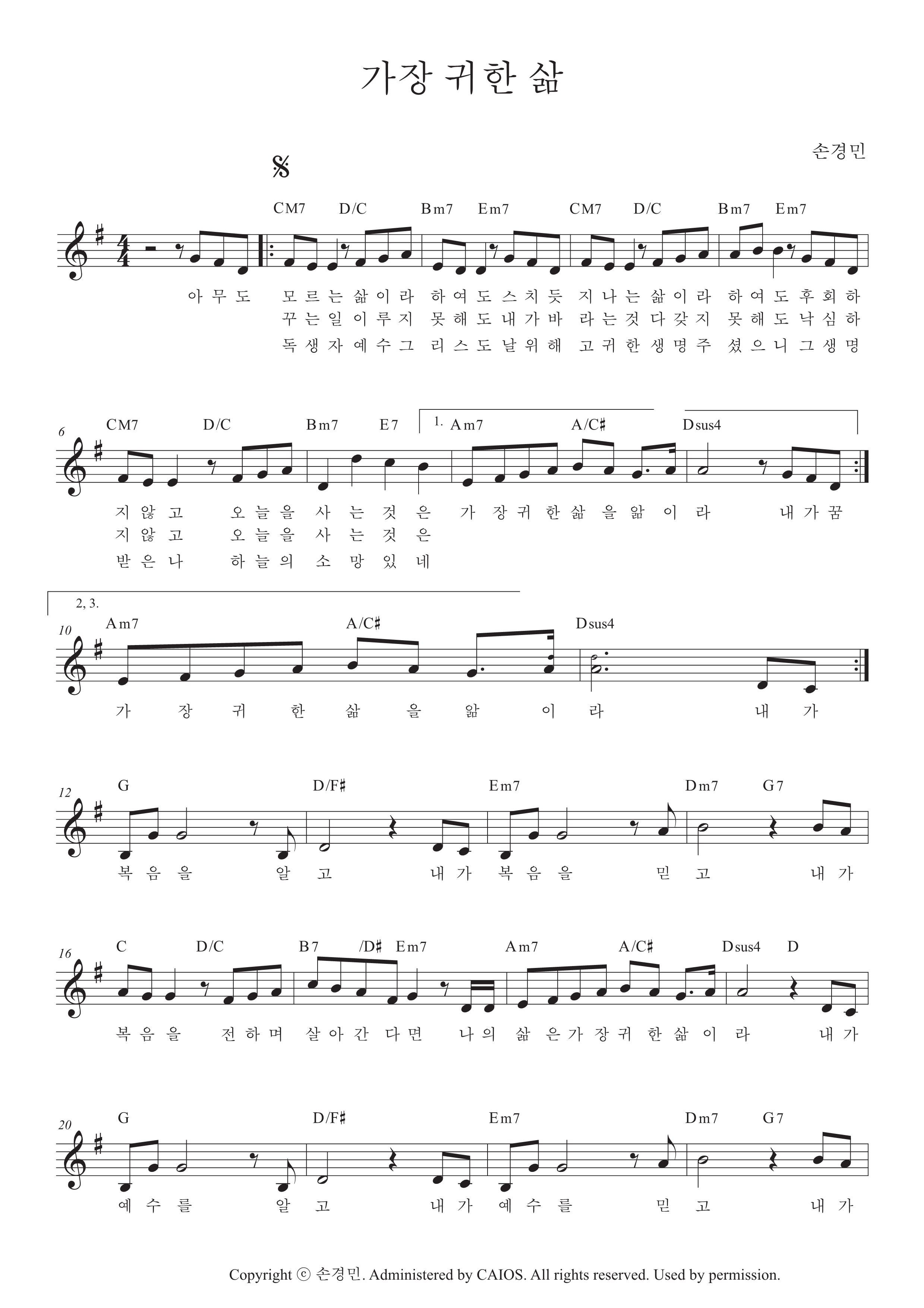 [찬양 악보/가사] 가장 귀한 삶 (with 김정희, 이기명, 우혜림) - 손경민 작사/작곡 A,F,G코드